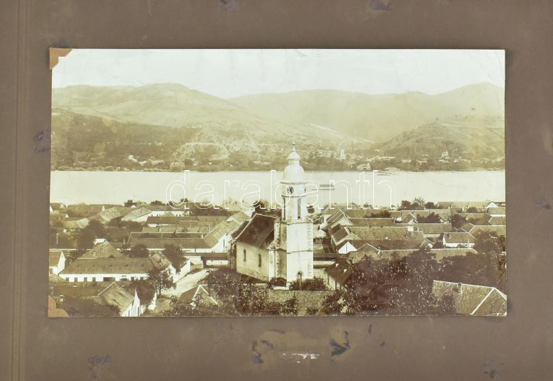 cca 1910-1920 Nagymaros látképe a templommal, hajómalommal, kartonra ragasztott, hidegpecséttel jelzett fotó Erdélyi budapetsi műterméből, kis szakadással, felületi törésnyomokkal, 16×27 cm