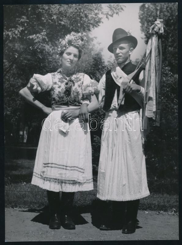 cca 1930-1940 Szendrő István (1908-2000): Alsóberecki népviselet (Gyöngyösbokréta mozgalom), a hátoldalon feliratozott, pecséttel jelzett fotó, 22,5x17 cm