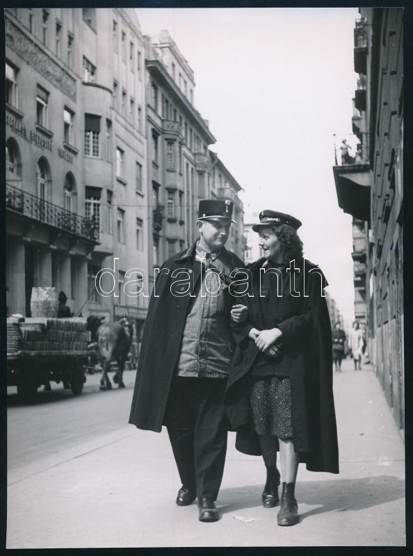 cca 1930-1940 Szendrő István (1908-2000): Postás pár Budapesten (XIII. ker., Tátra utca, baloldalt a Phönix-Turul ház), a hátoldalon feliratozott, pecséttel jelzett fotó, 23x17 cm