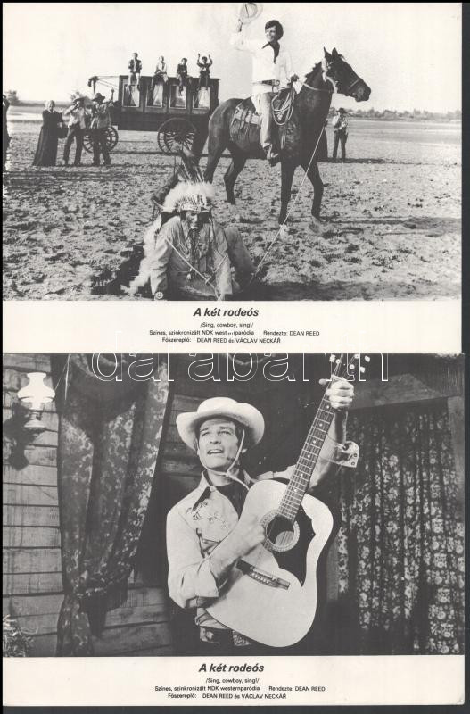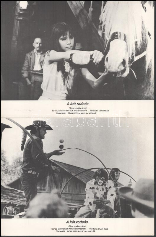 cca 1989 előtt készült, ,,A két rodeós" című NDK-beli film (Western paródia) jelenetei és szereplői, 10 db produkciós filmfotó (vitrinfotó, lobbyfotó) nyomdatechnikával sokszorosítva kartonpapírra, egyoldalas nyomással, a használatból eredő (esetleges) kisebb hibákkal, 18x24 cm