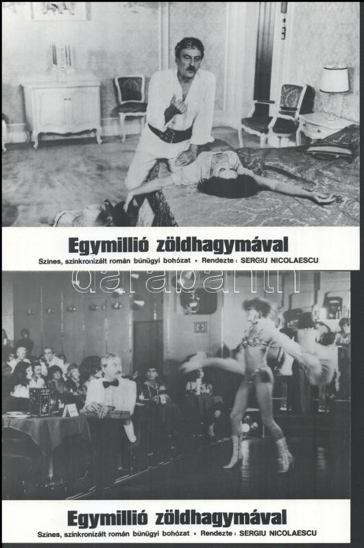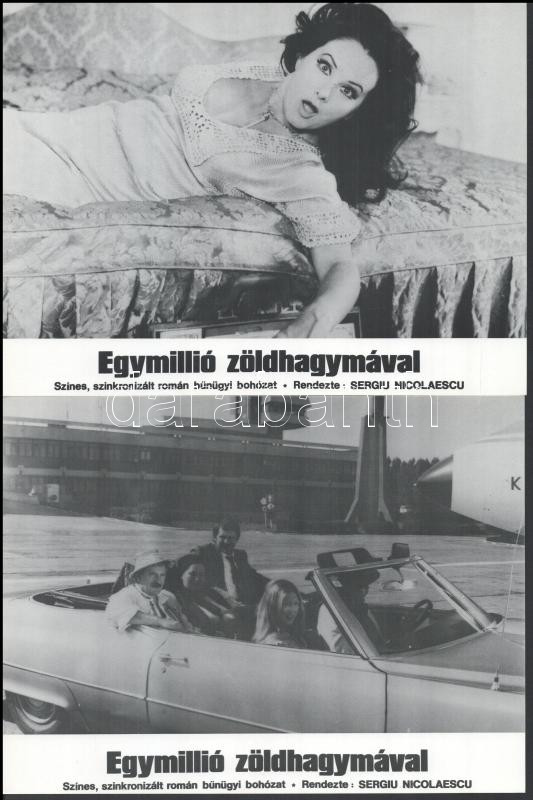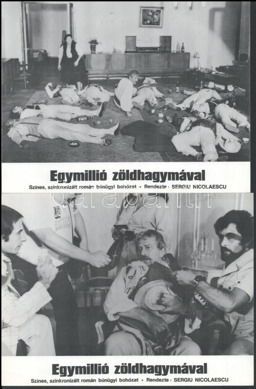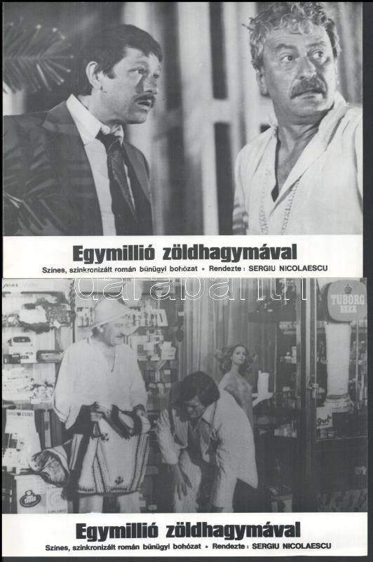 cca 1989 előtt készült, ,,Egymillió zöldhagymával" című román film jelenetei és szereplői, 8 db produkciós filmfotó (vitrinfotó, lobbyfotó) nyomdatechnikával sokszorosítva kartonpapírra, egyoldalas nyomással, a használatból eredő (esetleges) kisebb hibákkal, 18x24 cm