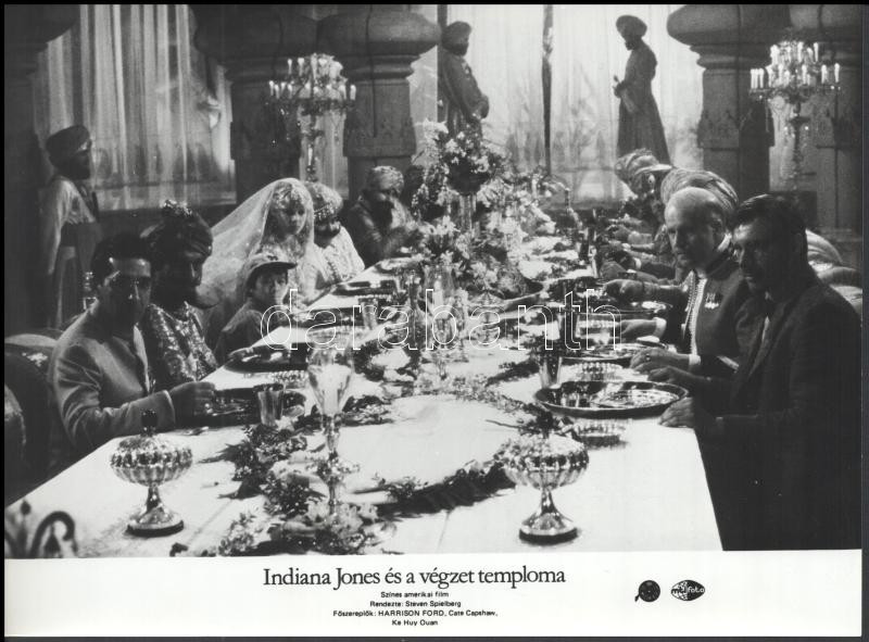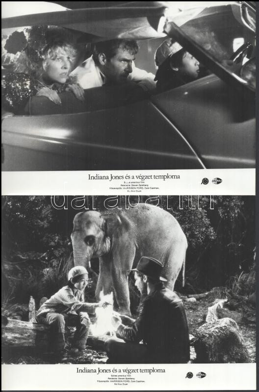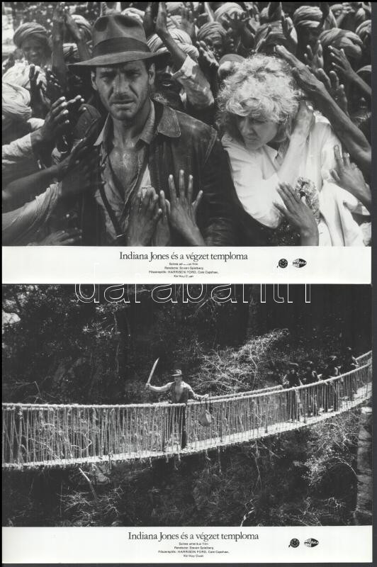 cca 1989 előtt készült ,,Indiana Jones és a végzet temploma" c. film öt jelenete Woody Allen főszereplésével, 5 db vintage produkciós filmfotó (vitrinfotó, lobbyfotó) ezüst zselatinos fotópapíron, a használatból eredő (esetleges) kisebb hibákkal, 18x24 cm