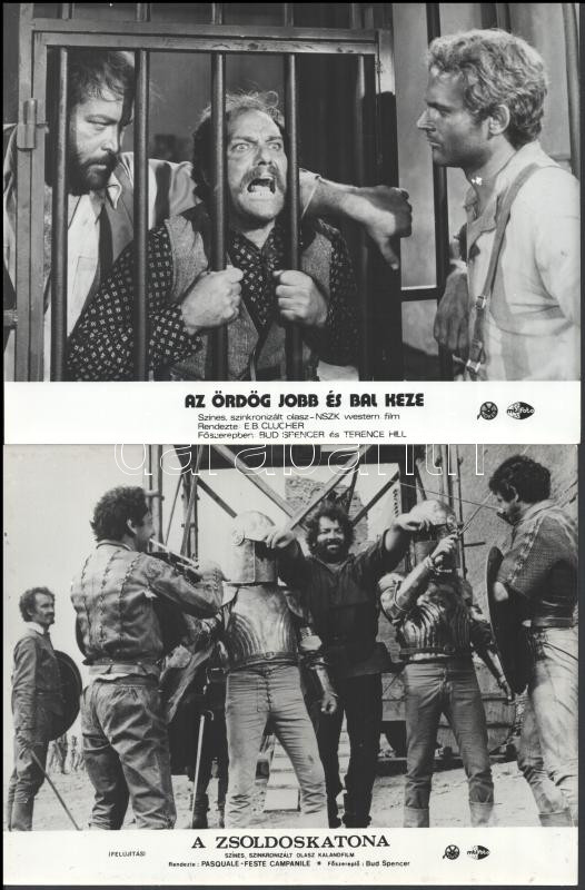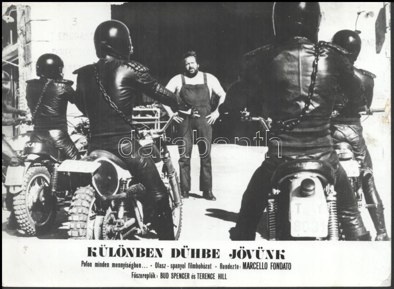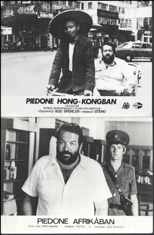 cca 1989 előtt készült filmek egy-egy jelenete Bud Spencer főszereplésével, 5 db vintage produkciós filmfotó (vitrinfotó, lobbyfotó) ezüst zselatinos fotópapíron, a használatból eredő (esetleges) kisebb hibákkal, 18x24 cm