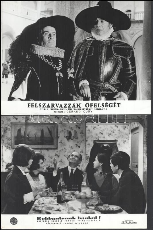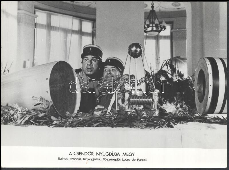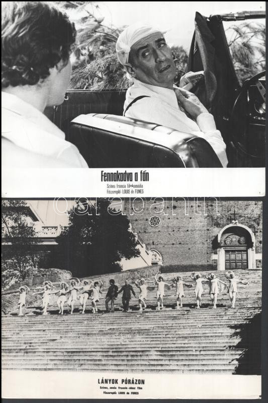 cca 1989 előtt készült filmek egy-egy jelenete Louis Funes főszereplésével, 5 db vintage produkciós filmfotó (vitrinfotó, lobbyfotó) ezüst zselatinos fotópapíron, a használatból eredő (esetleges) kisebb hibákkal, 18x24 cm