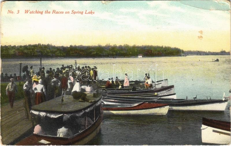 Leírás: Spring Lake (Michigan), Watching the races on Spring Lake, motorboats. Published by Will P. Canaan Co. No. 2447. (EB)