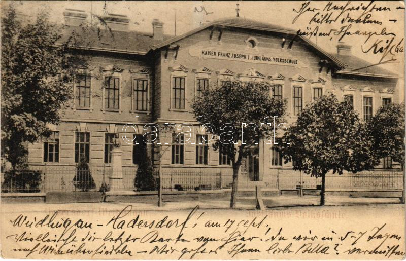 Leírás: 1905 Wien, Vienna, Bécs XIV. Penzing, Hadersdorf-Weidlingau, Kaiser Franz Joseph I. Jubiläums Volksschule / school (fl)
