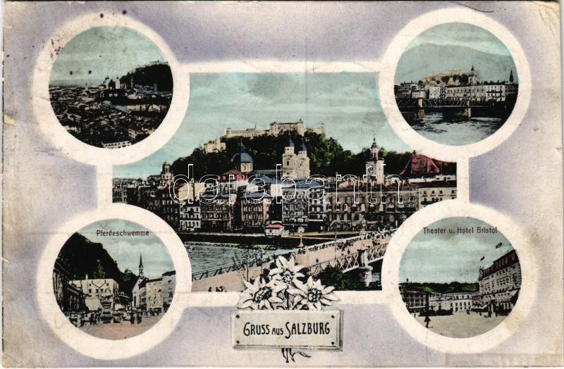 Leírás: 1918 Salzburg, Pferdeschwemme, Theater u. Hotel Bristol / castle, bridge, theatre, hotel, fountain. Floral (cut)
