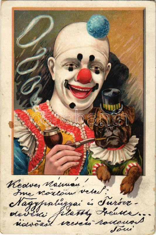 1900 Bohóc és pipázó kutya / Clown and dog smoking a pipe No. 7011. Ar... https://www.darabanth.com/hu/472-Gyorsarveres/472.0/Kepeslapok/Cirkusz~1500021/1900-Bohoc-es-pipazo-kutya-Clown-and-dog-smoking-a-pipe-No-7011-Art-Nouveau-litho-EB~II3198283
