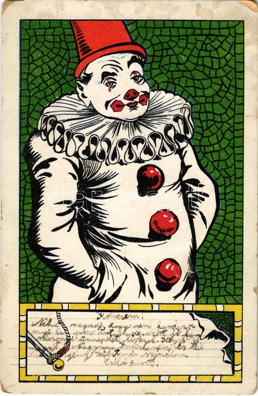 Bohóc. Szecessziós cirkuszi lap / Clown. Art Nouveau litho (EK) https://www.darabanth.com/hu/472-Gyorsarveres/472.0/Kepeslapok/Cirkusz~1500021/Bohoc-Szecesszios-cirkuszi-lap-Clown-Art-Nouveau-litho-EK~II3195527