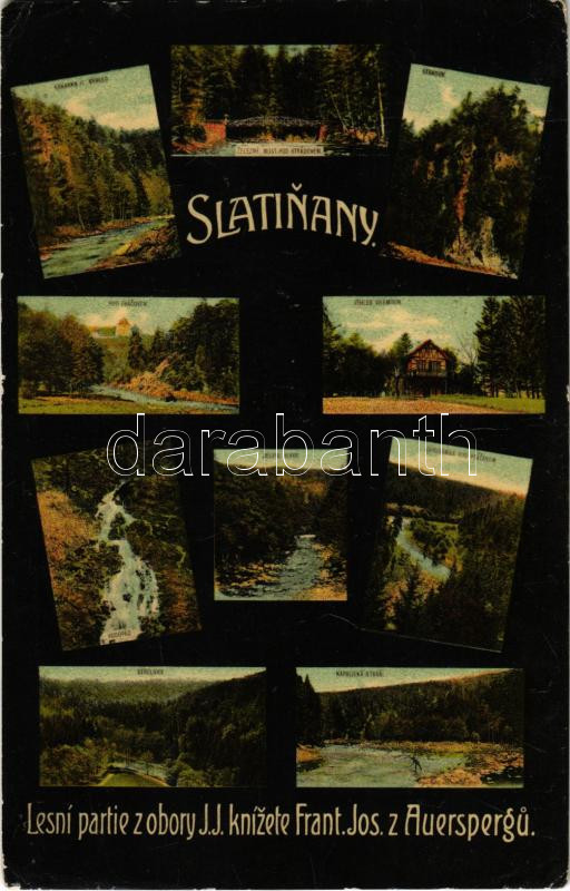 1912 Slatinany, Lesní partie z obory J.J. knízete Frant. Jos. z Auerspergu. Strelnice, Vodopad, Pod Pracovem, Krkanka il vyhled, Zelezny most podstrádovem, Stradov, Vyhled Vileminin, Chrudimka pod pracovem, Kapalická strán / forest details (EK)