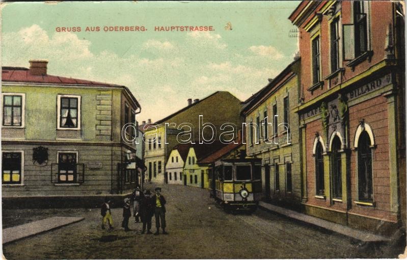Leírás: Bohumín, Oderberg; Hauptstrasse / main street, tram, Café Billard. W. L. Bp. 2938. (EB)