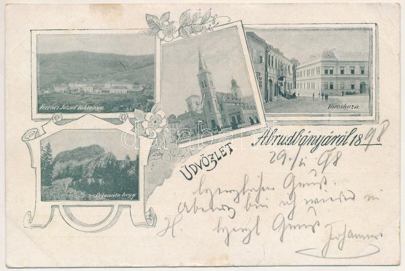 1898 (Vorläufer) Abrudbánya, Abrud; Ferenc József laktanya, A három magyar templom, Városháza, Detonáta hegy / K.u.K. military barracks, churches, town hall, Detunata mountain. Art Nouveau, floral (EB)