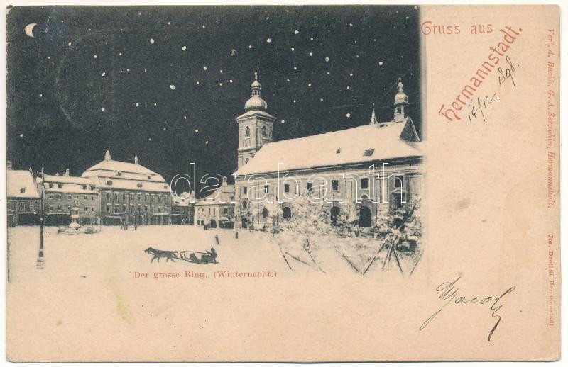 1898 (Vorläufer) Nagyszeben, Hermannstadt, Sibiu; Der grosse Ring (Winternacht) / Fő tér télen este, lovasszán. G. A. Seraphin kiadása. Jos. Drotleff / main square, winter night, horse sled (szakadás / tear)