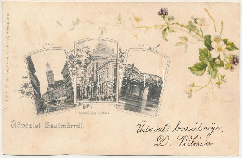 Leírás: 1899 (Vorläufer) Szatmárnémeti, Satu Mare; zárda, Igazságügyi palota, Vashíd. Lövy Miksa kiadása / nunnery, palace of justice, bridge. Art Nouveau, floral, litho (vágott / cut)