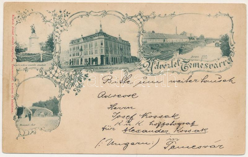 1899 (Vorläufer) Temesvár, Timisoara; Scudier emlékszobor, Józsefvárosi takarékpénztár palota, Béga sor, Hunyadi híd. Kossak József udvari fényképész kiadása és tulajdona / monument, savings bank, riverside, bridge. Art Nouveau, floral (fa)