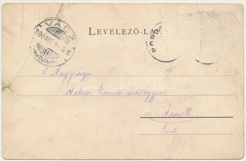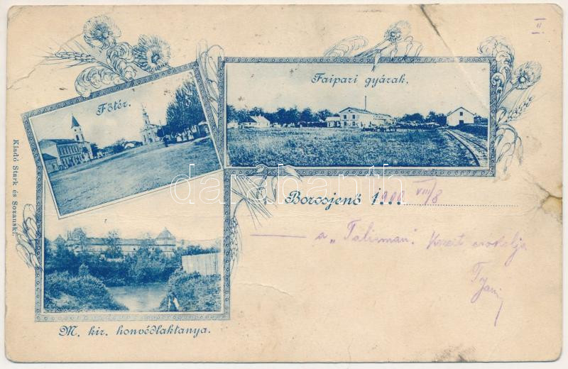 1900 Borosjenő, Borosineu, Ineu; Fő tér, M. kir. honvédlaktanya, Faipari gyárak. Stark és Sozanski kiadása / main square, K.u.K. military barracks, wood industry factory. Art Nouveau, floral (b)