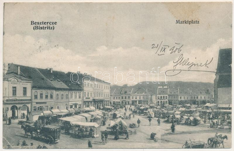 1906 Beszterce, Bistritz, Bistrita; Marktplatz / Piactér, Carl Lebkuch... https://www.darabanth.com/hu/472-Gyorsarveres/472.0/Kepeslapok/Erdely~1500007/1906-Beszterce-Bistritz-Bistrita-Marktplatz-Piacter-Carl-Lebkuchner-uzlete-W-Schneider-fel~II3198258