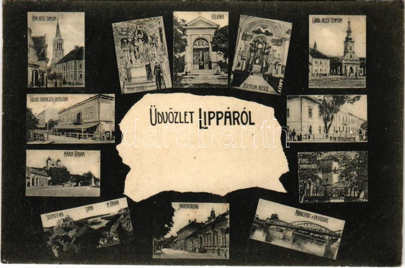1907 Lippa, Lipova; Római katolikus templom, Mária Lourdes, Kálvária, templom belső, Görögkeleti (ortodox) templom, József főherceg szálloda, M. kir. főerdőhivatal, Máriaradna, Solymosi vár, Járásbíróság, Marospart a vashíddal, Savanyúkút fürdő. Zeitler Lajos kiadása / Catholic church, calvary, Orthodox church, hotel, forestry office, Radna, Soimos castle, district court, Mures riverside with iron bridge, Sauerbrunn spa