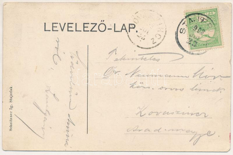 1908 Anina, Stájerlakanina, Stájerlak, Steierdorf; Római katolikus templom, vasgyár, látkép. Magyar zászlós és címeres keret / Catholic church, ironworks, factory, general view. Hungarian coat of arms and flag (EM)