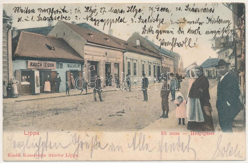 1908 Lippa, Lipova; Fő utca, Rauch Izidor zsidó férfi szabó üzlete, Lukács Lídia házi kenyérsütödéje. Konstántin Sándor kiadása / Hauptgasse / main street, shops, bakery (fl)