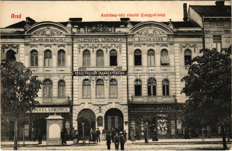 1909 Arad, Andrássy téri részlet, Lengyel ház, Cs. és kir. udvari szállító Lengyel Lőrinc bútorgyára, Guttmann és Berger üzlete, Aradi Polgári Takarékpénztár, Kossak fényképész / square, furniture warehouse, shops, savings bank (kis szakadás / small tear)