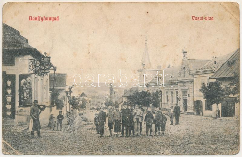 Leírás: 1909 Bánffyhunyad, Huedin; Vasút utca, üzlet / street, shop (EB)