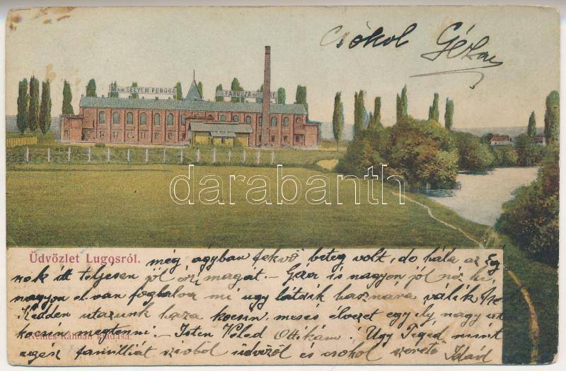 1909 Lugos, Lugoj; M. kir. selyemfonoda, gyár. Nemes Kálmán kiadása / ... https://www.darabanth.com/hu/472-Gyorsarveres/472.0/Kepeslapok/Erdely~1500007/1909-Lugos-Lugoj-M-kir-selyemfonoda-gyar-Nemes-Kalman-kiadasa-silk-spinning-mill-factor~II3198215