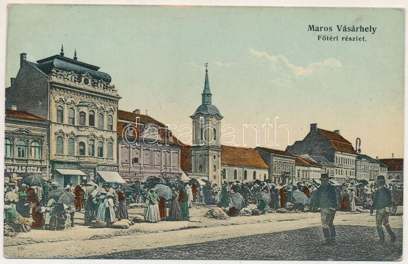 1909 Marosvásárhely, Targu Mures; Fő tér, piac, Petrás Géza, Szalmásy Gyula, Hary Géza, Schwartz János és József Emil üzlete. Porjes S. Sándor kiadása / main square, market, shops