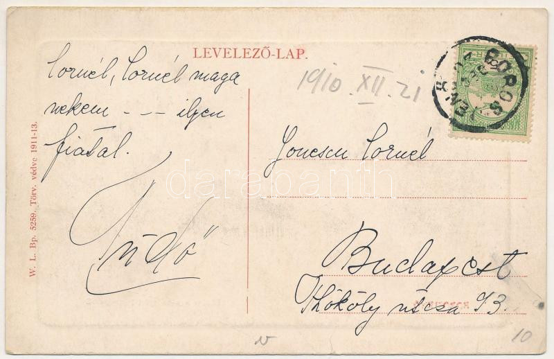 Leírás: 1910 Borosjenő, Borosineu, Ineu; Fő utca, Pénzügyőr laktanya. W.L. Bp. 5259. 1911-13. / main street, barracks of the financial officer (apró szakadás / tiny tear)