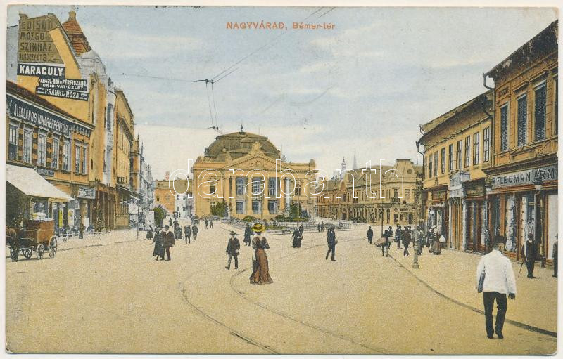 Leírás: 1911 Nagyvárad, Oradea; Bémer tér, színház, Edison mozgószínház (mozi), Általános Takarékpénztár, Karaguly, Frankl Róza üzlete. Vidor Manó kiadása / square, theatre, cinema, savings bank, shops (EK)