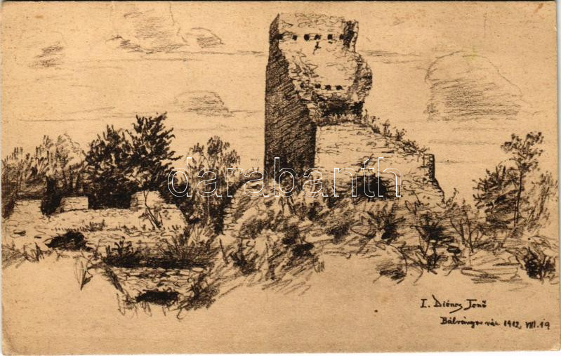 Leírás: 1913 Bálványosfürdő, Baile Balvanyos (Torja, Turja, Turia); Bálványosvár romjai északnyugatról nézve / castle ruins s: Diénes Jenő (ázott / wet damage)