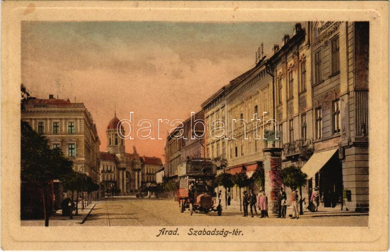 Leírás: 1914 Arad, Szabadság tér, autóbusz, Rozsnyay gyógyszertár, üzletek. Juhász és Társa kiadása / square, autobus, pharmacy, shops (fl)