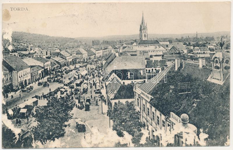 Leírás: 1914 Torda, Turda; látkép, piac, üzletek. Füssy József kiadása / general view, market, shops (felületi sérülés / surface damage)
