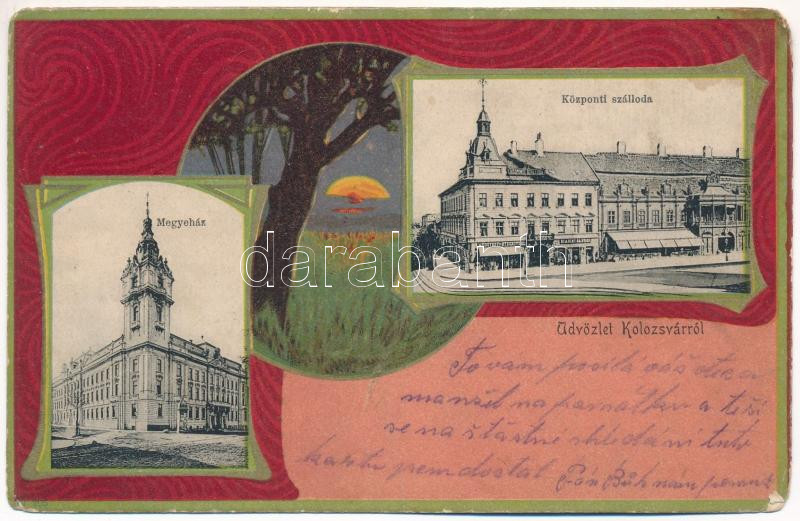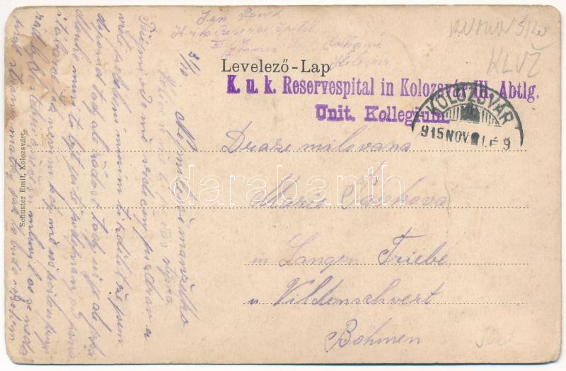1915 Kolozsvár, Cluj; Megyeház, Központi szálloda, Medgyesy és Nyegrutz és Biasini Sándor üzlete. Schuster Emil kiadása / hotel, shops, county hall. Art Nouveau litho + "K.u.k. Reservespital in Kolozsvár III. Abtlg. Unit. Kollegium" (fa)