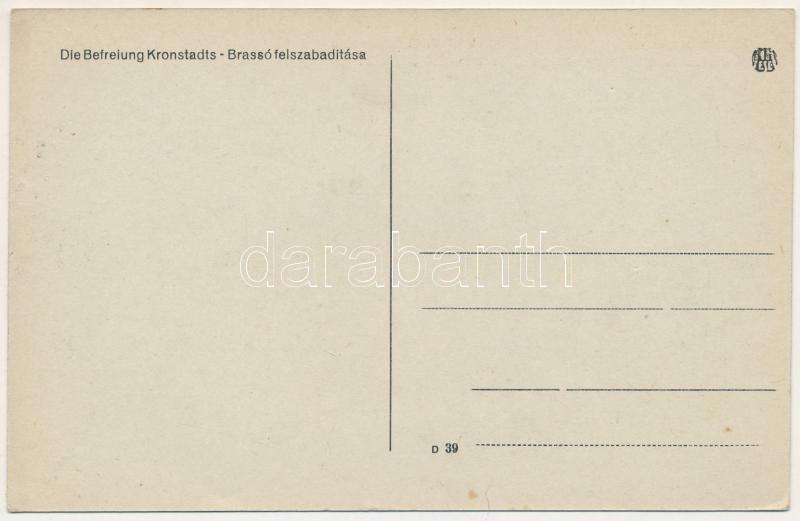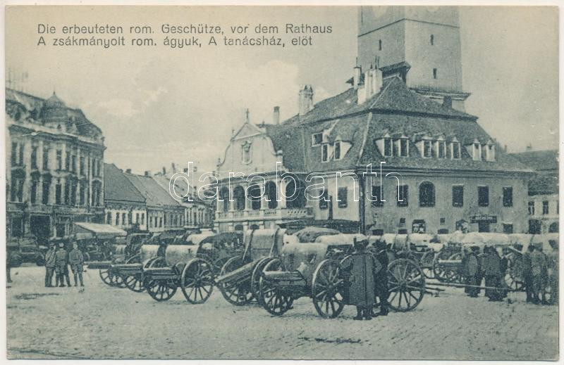 1916 Brassó, Kronstadt, Brasov; Die Befreiung Kronstadts, Die erbeuteten rom. Geschütze vor dem Rathaus / Brassó felszabadítása, a zsákmányolt román ágyúk a tanácsháza előtt / entry of the German troops, captured Romanian cannons in front of the town hall (EK)