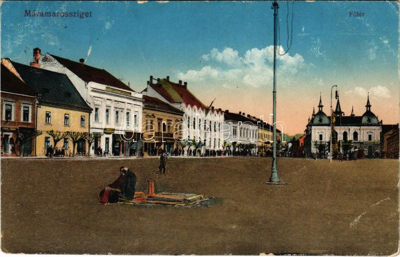 Leírás: 1916 Máramarossziget, Sighetu Marmatiei; Fő tér, piac, üzletek. Benkő Miklós kiadása / main square, market, shops (EK)