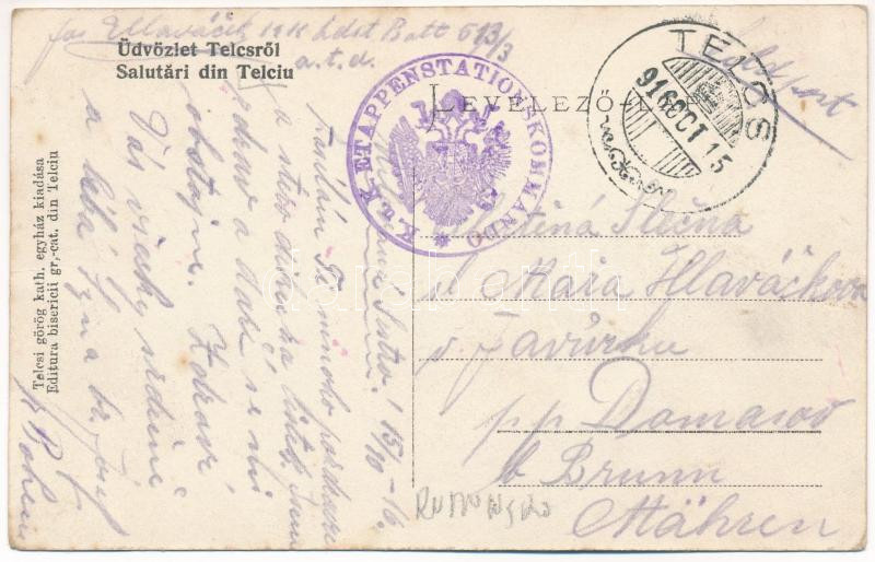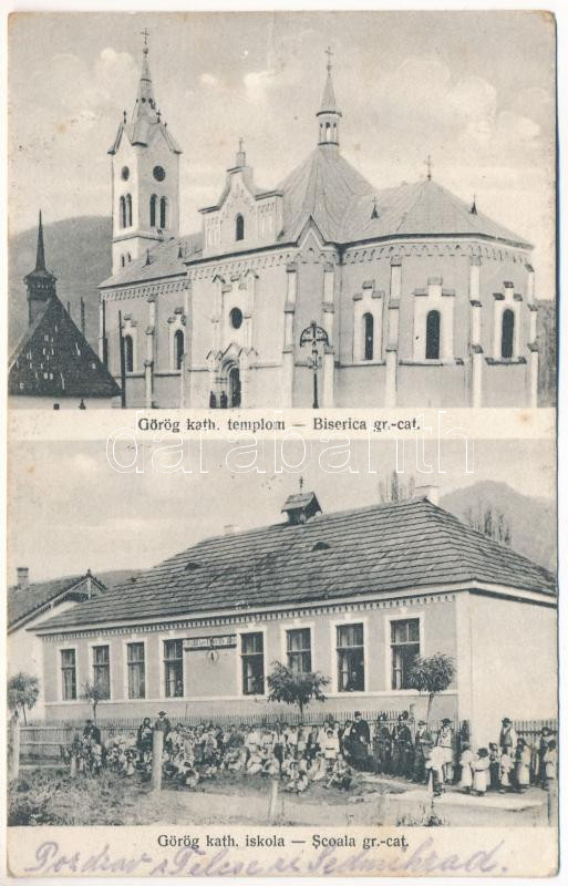 Leírás: 1916 Telcs, Telciu; Görög katolikus templom és iskola / Greek Catholic church and school