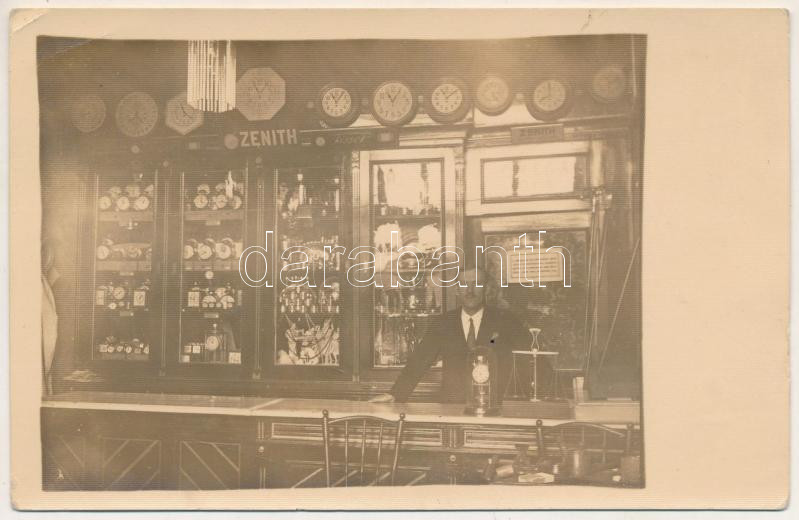Leírás: 1922 Medgyes, Mediasch, Medias; Kühn Frederic Uhrmacher / Kühn F. órakészítő üzlete, belső / clockmaker's shop, interior. photo (EB)