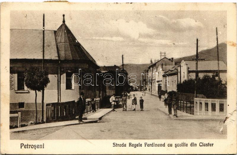 Leírás: 1925 Petrozsény, Petroseni, Petrosani; Ferdinánd király utca, iskola / Strada Regele Ferdinand cu scolile din Claster / street view, school (fl)