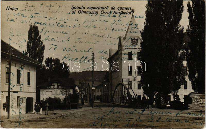 Leírás: 1928 Hátszeg, Hateg; Scoala superioara de comert si Gimnaziul G-ral Berthelot / Felső kereskedelmi iskola, gimnázium, szálloda, híd. Bálint Nagy kiadása. Foto. Ioanovits / trade school, grammar school, hotel, bridge (EK)