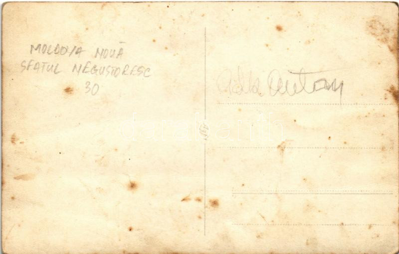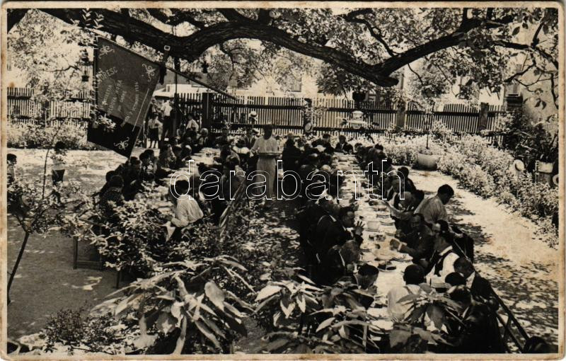 1934 Újmoldova, Neumoldowa, Bosneag, Moldova Noua; Sfatul negustoresc / üzleti ebéd, étterem kertje vendégekkel és pincérekkel / restaurant garden with guests and waiters. photo (fa)