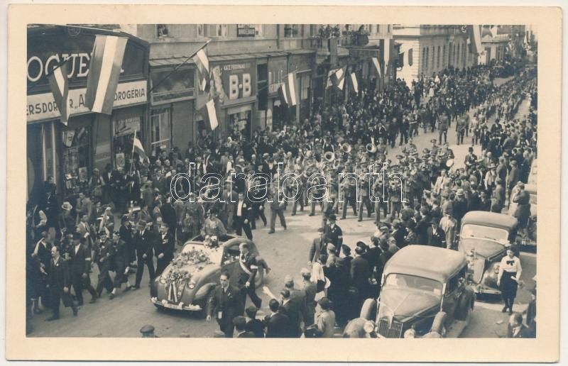 Leírás: 1940 Kolozsvár, Cluj; bevonulás, csendőr virágokkal feldíszített autóban, drogéria, Katz Ferdinánd üzlete / entry of the Hungarian troops, gendarme in automobile decorated with flowers, drugstore, shops. photo