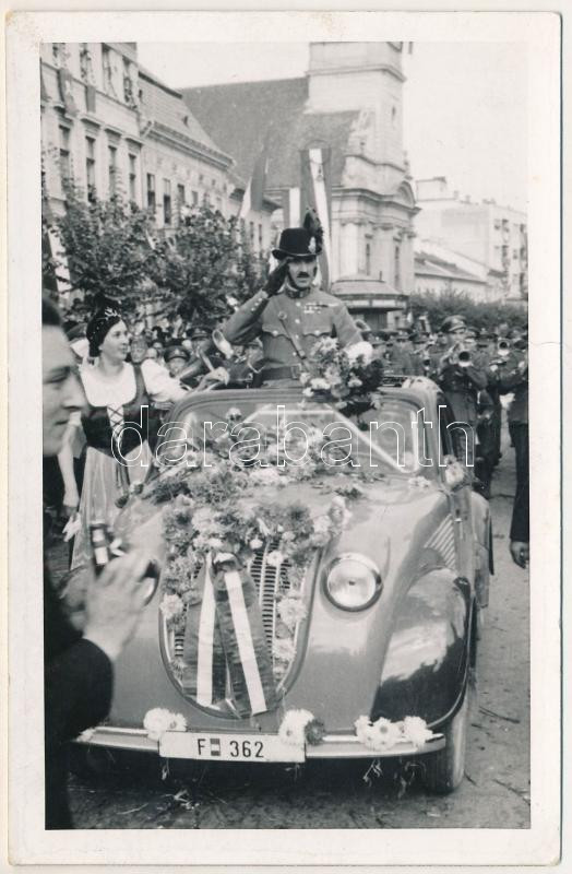 1940 Kolozsvár, Cluj; bevonulás, csendőr virágokkal feldíszített autóban, háttérben az evangélikus templom / entry of the Hungarian troops, gendarme in automobile decorated with flowers, Lutheran church. photo