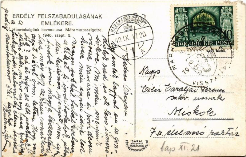 Leírás: 1940 Máramarossziget, Sighetu Marmatiei; bevonulás, katonák motorral, automobile / entry of the Hungarian troops, soldiers on motorbicycles, automobile + "1940 Máramarossziget visszatért" So. Stpl (EM)