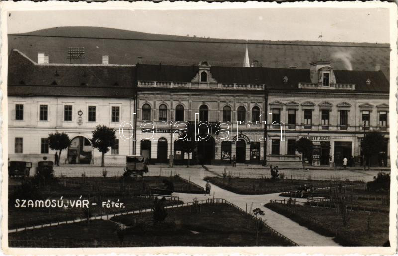 Leírás: 1940 Szamosújvár, Gherla; Fő tér, Elite kávéház és étterem, Covrik Teodor, Florian Jacob üzlete / main square, café and restaurant, shops. photo + "1940 Szamosújvár visszatért" So. Stpl.