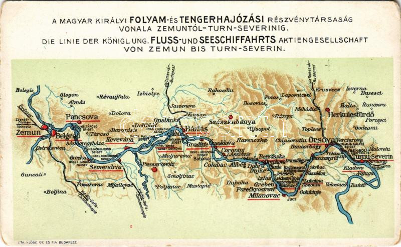 A Magyar Királyi Folyam- és Tengerhajózási Részvénytársaság (MFTR) vonala Zimonytól Szörényvárig / Map of The Royal Hungarian River and Sea Shipping Lines Company, line between Zemun and Turnu Severin. Klösz Gy. és Fia litho (EK)