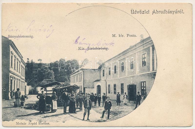 Abrudbánya, Abrud; M. kir. posta, Kir. Járásbíróság, Bányabiztosság, piac. Molnár Árpád kiadása / post office, district court, mine office, market (kis szakadás / small tear)