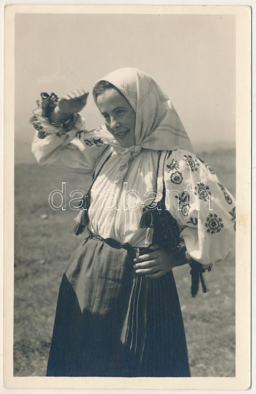 Leírás: Aranyosponor, Ponorel; Fata frumoasa / Dorfschöne / Erdélyi folklór / Transylvanian folklore. Foto orig. J. Fischer 1937.