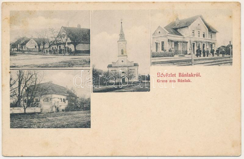 Leírás: Bánlak, Banloc; Fő utca, üzlet, templom, vasútállomás, Karátsonyi kastély / main street, shop, church, railway station, castle (fl)