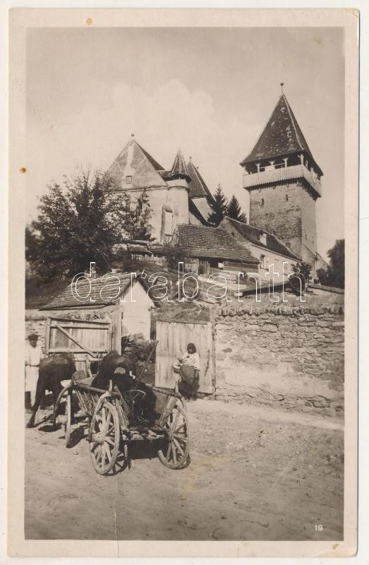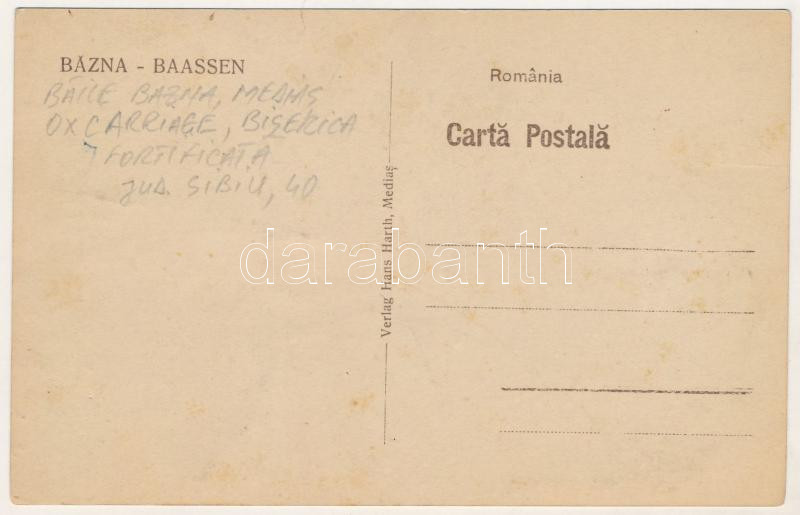 Leírás: Bázna, Báznafürdő, Felsőbajom, Bad Baassen, Baiumul de Sus; Evangélikus erődtemplom, ökrös szekér, erdélyi folklór / Lutheran castle church, Transylvanian folklore, ox cart (fa)